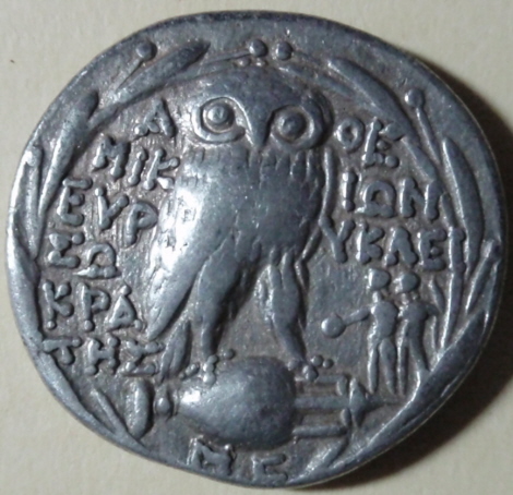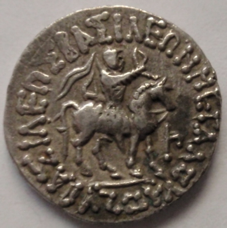 |   | WM n° 444 (Fiche) -160 / -155 Drachme - Paropamisades - Arachosie A/ BAΣIΛEΩΣ NIKHΦOPOY ANTIMAXOY R/ Maha rajasa jayadharasa Amtimakhasa |