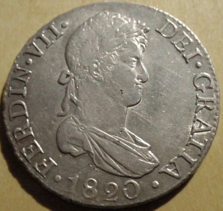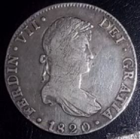 |   | WM n° 9120 (Fiche) 1820 8 Reales - México A/ FERDIN VII DEI GRATIA 1820 R/ HISPAN ET IND REX Mº 8 R J J |
