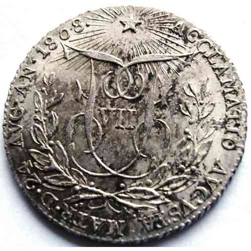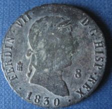 |   | WM n° 7167 (Fiche) 1814 8 Reales - Santiago A/ FERDIN VII DEI GRATIA 1814 R/ · HISPAN ET IND REX Sº 8 R F J |