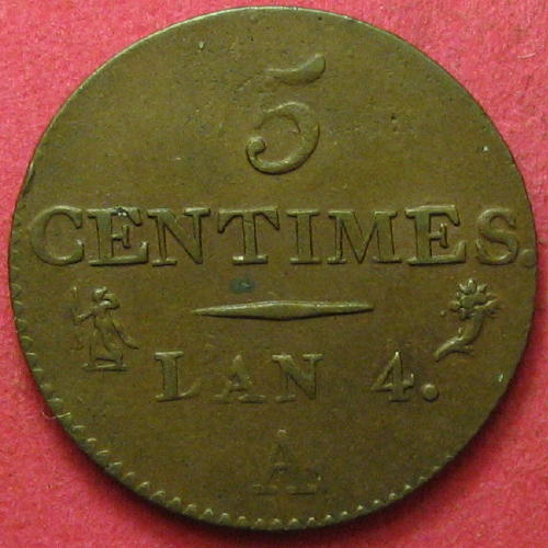 |   | WM n° 2636 (Fiche) AN 4 cinq centimes pt module - Paris A/ RÉPUBLIQUE FRANÇAISE R/ 5 CENTIMES |