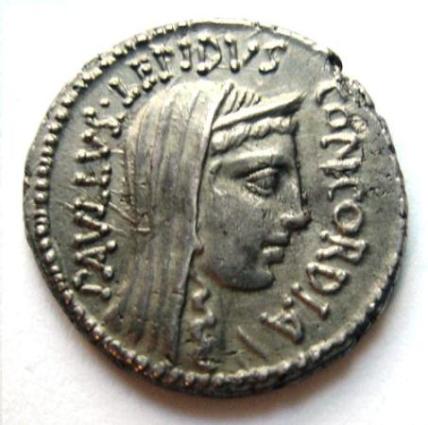 |  | WM n° 2119 (Fiche) 62 avant J.-C Denier - Rome A/ PAVLLVS LEPIDVS - CONCORDIA. R/ TER// [PAVLLVS] à l'exergue. |