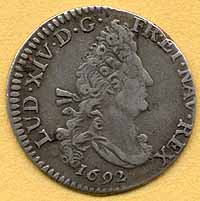 |   | WM n° 10577 (Fiche) 1692 4 sols aux deux L couronnés - Aix A/ LVD.XIIII.D.G.FR.ET.NAV.REX 1692 R/ DOMINE.SALVVM.FAC.REGEM & |