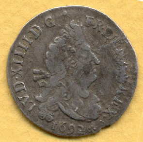 |   | WM n° 10205 (Fiche) 1692 4 sols aux deux L couronnés - Troyes A/ LVD. XIIII . DG FR . ET. NAV . REX .1692 . R/ DOMINE.SALVVM.FAC.REGEM. S couronné. |