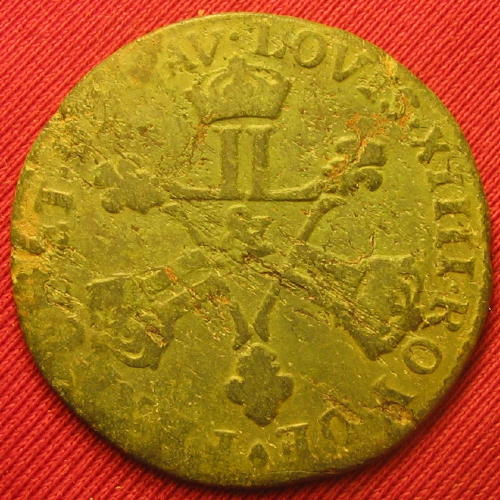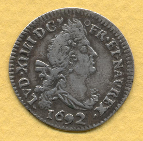 |   | WM n° 9750 (Fiche) 1692 4 sols aux deux L couronnés - La Rochelle A/ LVD.XIIII.D.G.FR.ET.NAV.REX 1692 R/ DOMINE.SALVVM.FAC.REGEM. H. |
