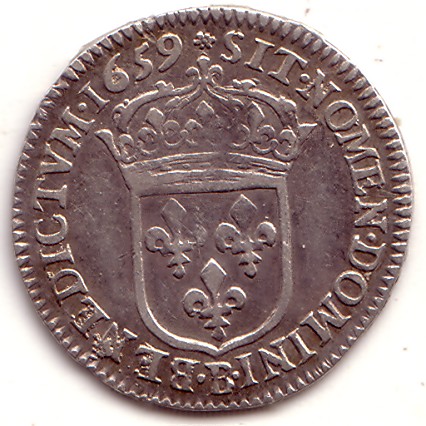 |   | WM n° 4727 (Fiche) 1653 1/2 écu à la mèche longue - St Lô A/ LVD.XIIII.D.G FR.ET.NAV.REX R/ SIT.NOMEN.DOMINI. C .BENEDICTVM 1653 |