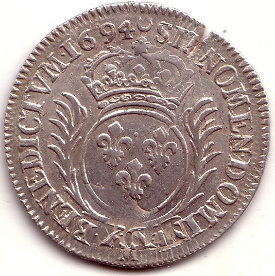 |   | WM n° 4730 (Fiche) 1694 1/2 écu aux palmes - Rennes A/ LVD.XIIII.D.G.FR.ET.NAV.REX R/ SIT.NOMEN.DOMINI. 9 .BENEDICTVM.1694 |