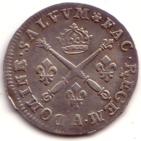 |   | WM n° 9751 (Fiche) 1692 4 sols aux deux L couronnés - Bayonne A/ LVD.XIIII.D.G FR.ET.NAV.REX.1692. R/ DOMINE.SALVVM.FAC.REGEM. L. |