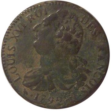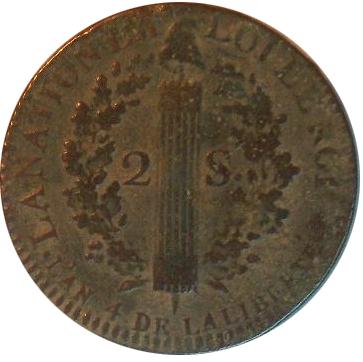 2 sols - Modernes (1789 à nos jours)WM n° 10081792Atelier : Montpellier, N22.5 gr. - 33 mm A/ LOUIS XVI ROI - DES FRANÇOIS/ 1792 °N°Grand buste de Louis XVI, tête nue, les cheveux noués dans le cou, drapé à gauche vu de trois quarts en arrière R/ LA NATION LA - LOI LE ROI/ L'AN 3 DE LA LIBERTEFaisceau orné d'une pique surmontée d'un bonnet phrygien dans une couronne de chêne. Collection privéeRef : Provenance : 34