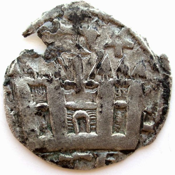Castillo de dos torreones laterales con puerta central grande y ancha de donde sale un vástago que termina en cruz central.