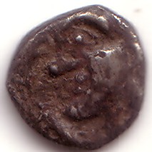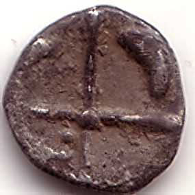 Obole à la tête cubiste ( Argent ) - GauloiseWM n° 1555Ie siècle av. J.-C.Atelier : 0.5 gr. - 8 mm A/ AnépigrapheTête de style cubiste à gauche, deux dauphins devant R/ AnépigrapheCroix bouletée au centre, cantonnée d´une lunule en un et deux, d´une hache en trois. Quatrième canton non visibleCollection privéeRef : Savès 405 var.