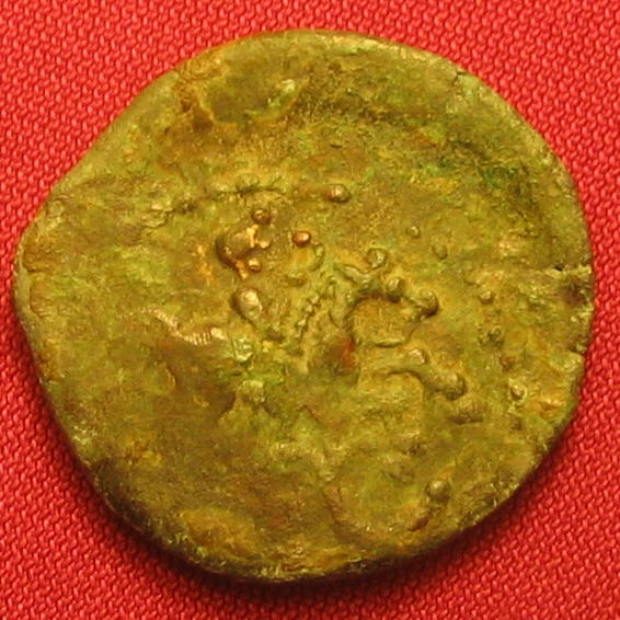 Bronze à légende TATINOS ( Bronze ) - GauloiseWM n° 1685Milieu du Ier siècle av. J.-C.Atelier : 3.32 gr. - 20 mm A/ AnépigrapheTête barbue à droite, bandeau dans les cheveux R/ TATINOS (non visible)Cavalier à droite tenant un torque bouleté de la main droite, grènetisCollection privéeRef : Lopez XIV