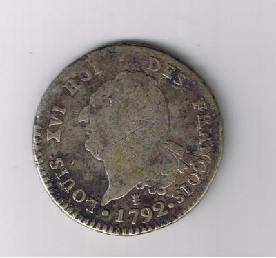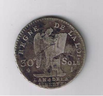 30 sols ( Argent ) - Modernes (1789 à nos jours)WM n° 17971792Atelier : Limoges10 gr. - 0 mm A/ LOUIS XVI ROI - DES FRANÇOIS. 1792 R/ REGNE DE LA LOI. L'AN 4 DE LA - LIBERTÉ.Génie gravant la Constitution posée sur un autel à droiteCollection privéeRef : Gadoury 39Les rayures sur le portrait me font plus penser à un prélèvement d'argent, peut-être par les ouvriers, qu'à un but anti-royaliste. Il y a en effet beaucoup d'écus avec ces rayures. Un peu d'argent par ci un peu par là... A moins qu'il ne s'agisse de prélèvements faits à l'atelier pour ajuster le poids.