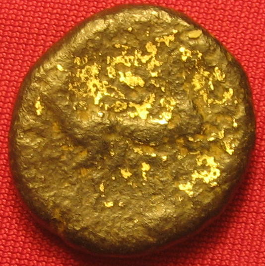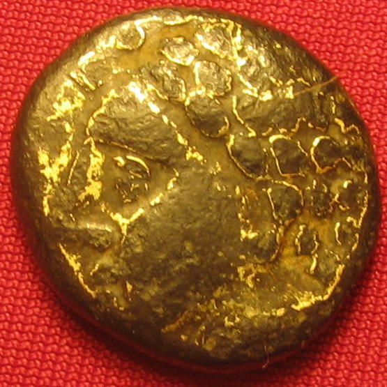 Faux statère du type de Lapte ( Bronze ) - GauloiseWM n° 2104IIe siècle av. J.-C.Atelier : 4.49 gr. - 18 mm A/ AnépigrapheTête à gauche, restes de dorure R/ AnépigrapheBige à droite, lyre dessous, restes de dorureCollection privéeRef : DT 3375 - 3376 var.