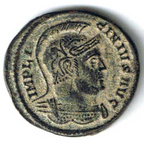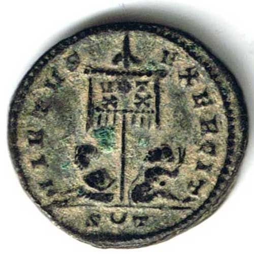Follis ( Vellón ) - Bajo Imperio RomanoWM n° 2271320 d. C.Atelier : Ticinum3.3 gr. - 20 mm A/ IMP LICINIVS AVGBusto del emperador, con casco y coraza, hacia la derecha. R/ VIRTVS EXERCIT.Estandarte con la inscripción VOT XX, dos cautivos sedentes. Exergo: ST (Creciente entre estas). Collection privéeRef : m41g