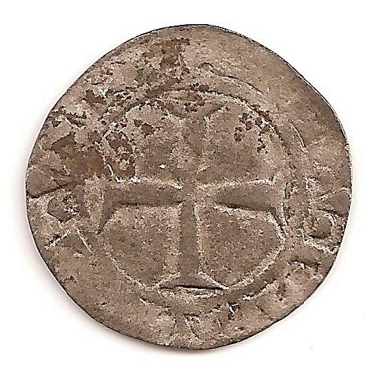 double tournois ( Billon ) - RoyalesWM n° 259111/09/1389Atelier : Paris1.28 gr. - 21 mm A/ mOn-ETA - DVP-LEX Croix fleurdelisée dont les lis coupent la légende. R/ KAROLVS: FRACORVTrois lis posés 2 et 1.Collection : arendilRef : L.392a - Dy.393AProvenance : 58