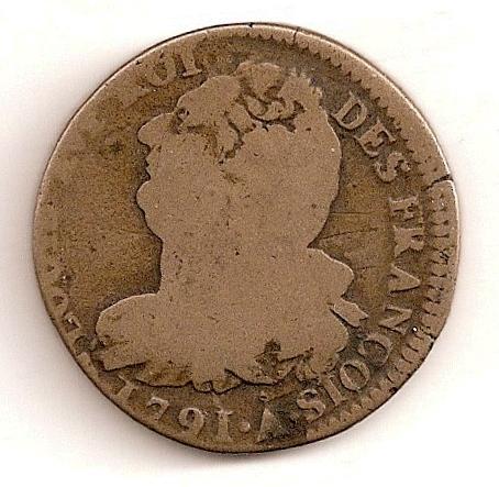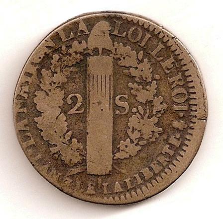 deux sols au faisceau ( Cuivre ) - Modernes (1789 à nos jours)WM n° 26261791 - 3 de la libertéAtelier : Paris (couvent des Barnabites)20.42 gr. - 33 mm A/ LOUIS XVI ROI DES FRANÇOISGrand buste de Louis XVI, tête nue, les cheveux noués dans le cou, drapé à gauche vu de trois quarts en arrière R/ LA NATION LA LOI LE ROIFaisceau orné d'une pique surmontée d'un bonnet phrygien dans une couronne de chêneCollection : arendilRef : C.2249 - Maz.24-31 - Dy.1722 - R.37/3 - Dr/Mer.14Provenance : 58type "françois", 150.000 exemplaires (?)