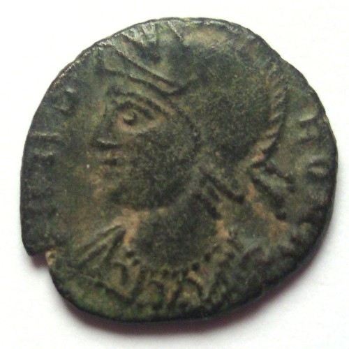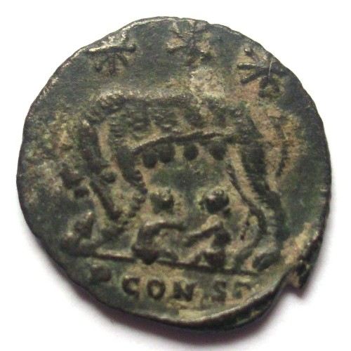 Centenional (AE 3) ( Bronce ) - Bajo Imperio RomanoWM n° 3214334 d.C.Atelier : Arelate (Arlés - Fr.)1.5 gr. - 16 mm A/ VRBS ROMA Alegoría de Roma hacia la izquierda, portando casco y atuendo imperial. R/ AnepígrafaLoba hacia la izquierda, amamantado a Rómulo y Remo; arriba dos estrellas de ocho puntas y entre ellas crismón. En exergo PCONSTCollection privéeRef : RIC 385