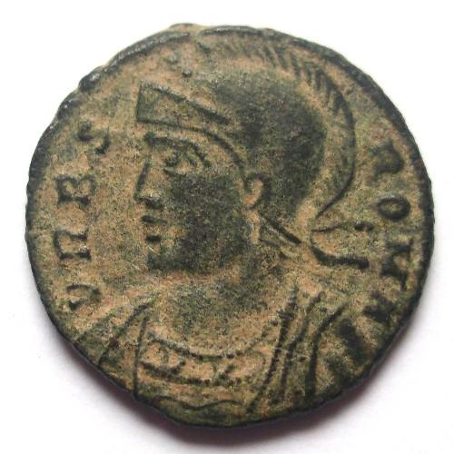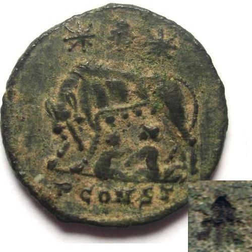 Centenional (AE 3) ( Bronce ) - Bajo Imperio RomanoWM n° 3215330-348 d.C.Atelier : Arelate (Arlés - Fr.)2.5 gr. - 18 mm A/ VRBS ROMAAlegoría de Roma hacia la izquierda, portando casco y atuendo imperial. R/ AnepígrafaLoba hacia la izquierda, amamantado a Rómulo y Remo; arriba dos estrellas de ocho puntas y entre ellas algo sin identificar. En exergo PCONSTCollection privéeRef :