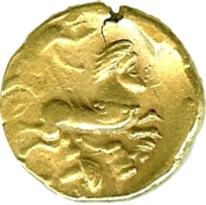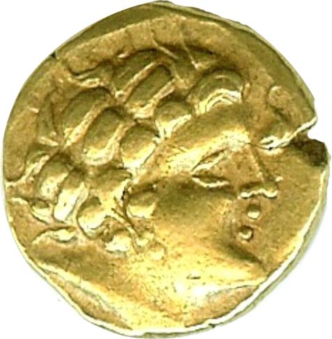 Statère d'or au cheval androcéphale et au personnage allongé ( Or ) - GauloiseWM n° 323480-50 AC.Atelier : 7.57 gr. - 21 mm A/ Anépigraphe.Tête à droite, les cheveux coiffés en mèches tirées en arrière tombant sur le cou ; une boucle d’oreille sur la joue. R/ Anépigraphe.Cheval androcéphale galopant à droite, conduit par un aurige ; derrière, reste de roue ; sous le cheval, personnage couché à droite, tenant un poignard et une lance.Collection privéeRef : LT.6852