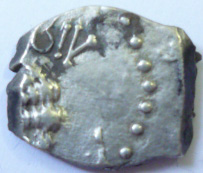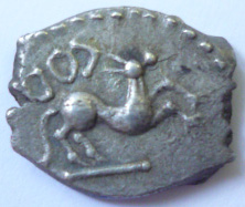 Drachme au daim - GauloiseWM n° 480Ier siècle avant J-C.Atelier : 1.8 gr. - 12 mm A/ VIIRIAtete a droite R/ COP ou CODAnimal à droite (daim ? cheval ?)Collection : buseRef : Provenance : 30