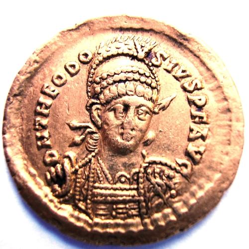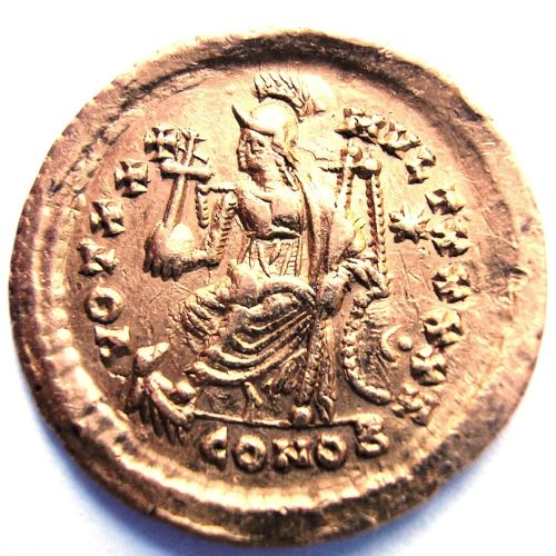 Solido ( Oro ) - Bajo Imperio RomanoWM n° 4804430-440 d.C-Atelier : Constantinopla4.4 gr. - 17 mm A/ D N THEODOSIVS P F AVGBusto de frente con coraza y casco, portando lanza y escudo. R/ VOT XXX MVLT XXXXConstantinopla sedente a la izquierda, portando cetro y globo rematado por cruz; escudo apoyado en trono, el pie izquierdo sobre la proa de una galera; en el campo a la derecha una estrella. En el exergo CONOB. (oficina)H Collection privéeRef : RIC X 247 - - - Cayón página 2907, nº 19 - - - - Salgado página 306, nº 9509