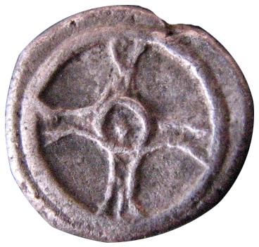 Obole phocaïque à la tête casquée ( Argent ) - Grecque marseillaiseWM n° 49193ème quart du V ème av jc Atelier : Marseille0.72 gr. - 0 mm A/ AnépigrapheTête casquée à droite, roue sur le casque R/ AnépigrapheRoue à quatre rayons entretoisés sur la janteCollection privéeRef : LT 520Provenance : 34