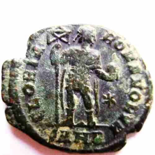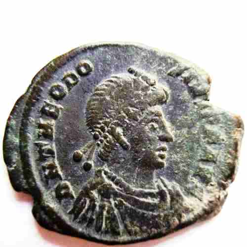 Decárgiro o Maiorina reducida. (AE2) ( Bronce ) - Bajo Imperio RomanoWM n° 5081392-395 d.C.Atelier : Heraclea5.3 gr. - 20 mm A/ D N THEODO-SIVS P F AVGBusto del emperador drapeado con coraza y diadema de perlas a la derecha. R/ GLORIA - ROMANORVMTeodosio estante, de frente y mirando a la derecha, portando estandarte con su mano derecha y globo en la izquierda. Exergo: SMHB. Estrella de seis puntas en el campo derecho.Collection privéeRef : RIC IX Heraclea 27a - - - Cayón página 2805, nº 52. - - - Salgado página nº 289, nº 9232.