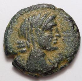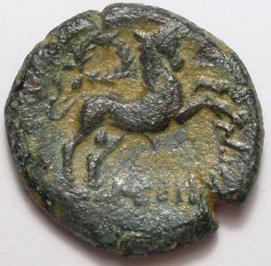 As au taureau ( Bronze ) - GauloiseWM n° 5464IIe - Ier siècles avant J.-C.Atelier : Montlaurès10.35 gr. - 25 mm A/ EITête féminine voilée à droite avec le petit chignon. R/ NERONKEN (ou NERONCEN)Taureau bondissant à droite ; au-dessus, une couronne.Collection privéeRef : LT.2488