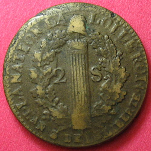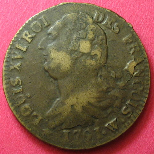 2 sols ( Cuivre ) - RoyalesWM n° 55671791Atelier : Lille24.03 gr. - 33 mm A/ LOUIS XVI ROI DES FRANCOIS 1791 WBuste de Louis XVI à gauche R/ LA NATION LA LOI LE ROI L´AN 3 DE LA LIBERTECollection privéeRef : R.-37.16Point sous le U = second semestre