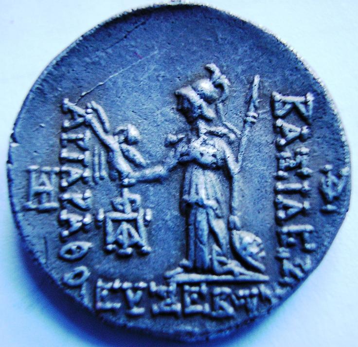 Dracma ( -- ) - GriegaWM n° 5660Del 163 a 159 y del 157 a 130 a.CAtelier : 4 gr. - 15 mm A/ AnepígrafaBusto diademado a la derecha. R/ BAEIAEomegaE // APIAPAQOV // EVEEBOYEAtenea estante a la izquierda, sujetando con una mano la lanza y un escudo, y en la otra una lanza. En el campo tres anagramas, y en el exergo la fecha (?) de la acuñación.