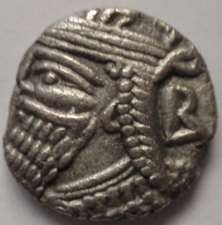 Cabeza a izquierda del rey de Partia Vologeses IV con barba y corona.