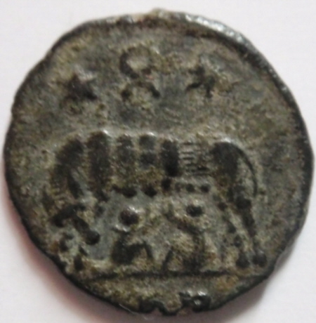 Ae-19 ( Cobre ) - Bajo Imperio RomanoWM n° 6308306-337Atelier : Roma2.99 gr. - 0 mm A/ URBS ROMA R/ Anepígrafa.Sobre exergo los gemelos Romulo y Remo amantados por la loba capitolina (mito fundacional de Roma) encima dos estrellas alusivas a los protectores de la ciudad (Castor y Polux) y corona cívica.Collection : PatriciaRef :
