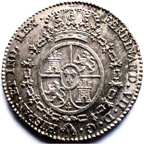 R/ FERDINAND ● VII ● D ● G ● HISPAN ● ET IND ● REX ●Escudo de España con escusón de los Borbones.Collection privéeRef : A. Herrera: Medallas de Proclamación y Juras de los Reyes de España. Madrid 1882, lámina 75-2.Módulo de 2 reales.- - Variante; rama izquierda de laurel terminada en 3 hojas. - - - - - - El 24 agosto de 1808 se proclamó rey a Fernando VII en Madrid.