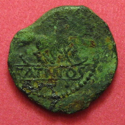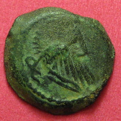 Tête barbue à droite, très stylisée. Chevelure et barbe représentées par des traits simples, absence de bouche. Bandeau dans les cheveux, grènetis liés