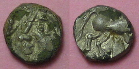 Le dessous du cheval est non identifiable. Peut être une palmette. Monnaie fourrée