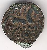 Bronze au cheval ( Bronze ) - GauloiseWM n° 8203c.60-50 AC. Atelier : 2.6 gr. - 15 mm A/ AnépigrapheRestes de tête humaine à gauche, stylisée, accostée de deux globules. R/ AnépigrapheCheval à encolure galopant à droite ; au-dessus du cheval, une ligne en zigzag et des annelets ; entre les jambes, un annelet cerclé et globulé.Collection privéeRef : LT.7034