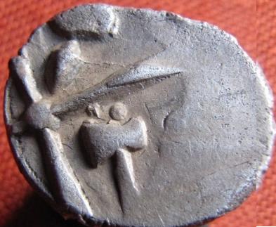 Drachme à la tête cubiste ( Argent ) - GauloiseWM n° 8235Fin du IIe et Ie siècles av. J.-C.Atelier : 2.9 gr. - 15 mm A/ AnépigrapheTête de style cubiste à gauche, deux dauphins devant R/ AnépigrapheCroix bouletée au centre, cantonnée d´une ellipse en un, d´un croissant et d´une balle de fronde en second, d´un croissant et d´une hache en trois et quatre. Les deux haches sont affrontésCollection privéeRef : Provenance : Haute-Garonne