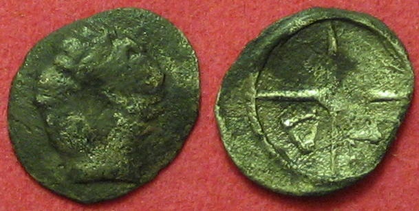 obole ( Argent ) - Grecque marseillaiseWM n° 8391-75/-25Atelier : Péri-massaliète0.39 gr. - 0 mm A/ AnépigrapheTête stylisée à gauche R/ ΔMRoue à quatre rayons cantonnée les lettres Δ et MCollection privéeRef : - - -