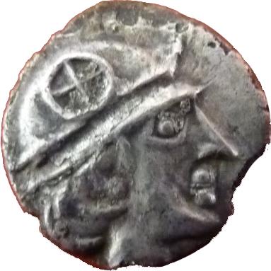 Obole à la tête casquée ( Argent ) - Grecque marseillaiseWM n° 8734Fin du Ve siècle av. J.-C.Atelier : Marseille0.65 gr. - 5 mm A/ AnépigrapheTête casquée à droite, roue sur le casque R/ LettresRoue à quatre rayons entretoisés sur la janteCollection privéeRef :