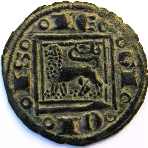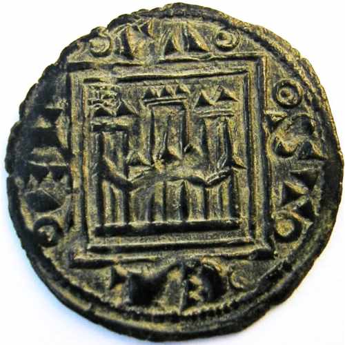 Pujesa u óbolo ( Vellón ) - MedievalWM n° 89621277-1284Atelier : Burgos0.5 gr. - 13 mm A/ ᵒCAᵒ ᵒSTᵒ ᵒELᵒ ᵒELᵒCastillo de tres torres dentro de campo, rodeado de doble gráfila lineal cuadrada, y otra circular externa que contiene la leyenda CASTELEL* separada por roeles. Marca de ceca B sobre la torre izquierda. R/ ᵒLEᵒ ᵒGIᵒ ᵒONᵒ ᵒISᵒLeón a izquierda en el campo, rodeado de doble gráfila lineal cuadrada, y otra circular externa, lineal, que contienen la leyenda LEGIONIS separada por roeles. Marca de ceca B en el angulo superior derecho.Collection privéeRef : Variante no catalogada. A. Roma nº 209. 1 -variante F.A.B nº 221 (Ed. 80) Cayón nº 1117 (Ed. `98) Variante al presentar marca de ceca B en anverso sobre la torre derecha y en reverso sobre la cola del león. (*) También presenta variante en la leyenda del anverso ᵒCAᵒ ᵒSTᵒ ᵒELᵒ ᵒELᵒ