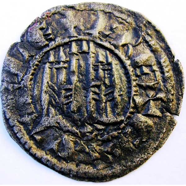 Dinero ( Vellón ) - MedievalWM n° 9040Emisión de 1297Atelier : Sevilla0.8 gr. - 17 mm A/ + F REX CASTELLECastillo con tres torres dentro de gráfila circular, debajo marca de ceca: S R/ + ET LEGIONISLeon a izquierda dentro de gráfila circular.Collection privéeRef : A. Roma nº 215.2 A. Burgos nº 265 (Ed. 80) Cayón nº 1165Tanto Álvarez Burgos como Cayón denominan esta moneda como Pepión.