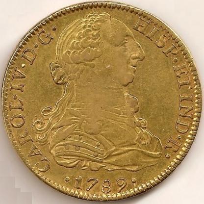 8 Escudos de oro ( Oro ) - ModernaWM n° 91991789Atelier : México0 gr. - 32 mm A/ CAROL • IV • D • G • HISP • ET IND • R • •1789•Busto con peluca de Carlos IV drapeado y con coraza, a la derecha. R/ IN • UTROQ • FELIX • • AUSPICE • DEO •Mº• •FM•Escudo de armas coronado entre 8 y S (valor) rodeado del Toisón de oro. Bajo éste ''M'' con º encima como marca de ceca y FM como siglas de ensayador. Collection privéeRef : Provenance : ebay