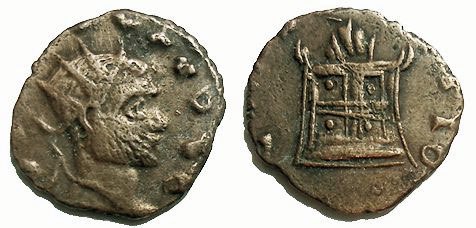 Tête radiée de Claude II à droite, avec pan de paludamentum sur l'épaule gauche (O2).