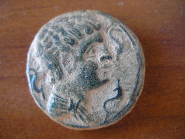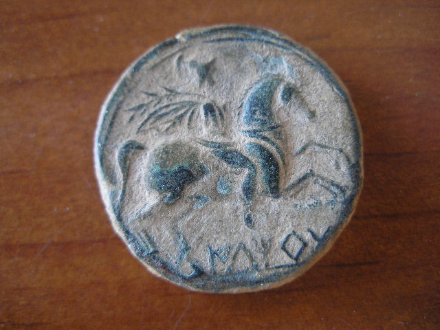 Unidad ( Bronce ) - IbéricasWM n° 9408Emisiones de despues del 104 A.C.Atelier : ILTIRTA11.8 gr. - 25 mm A/ AnepigrafoCabeza viril a derecha, rodeada por tres delfines, con dos rizos detrás de la oreja, de buen estilo. R/ ILTIRTAJinete con palma y clámide, debajo inscripción ibérica ILTIRTA.Collection : nayoxRef : CNHProvenance : 25
