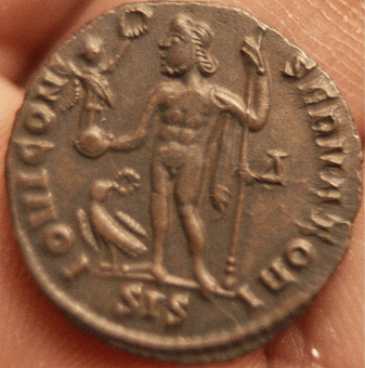 AE2 o follis ( Bronze ) - Bajo Imperio RomanoWM n° 9684313-315 d.C.Atelier : Siscia3 gr. - 20 mm A/ IMP LICINIVS P F AVGCabeza laureada a derecha de Licinio I. R/ IOVI CON-SERVATORIJúpiter desnudo estante a izquierda portando cetro y victoria sobre globo. A sus pies a la izquierda un águila con una guirnalda en el pico. A la derecha en el campo una Δ marcando que se acuñó en la 4ª oficina.
